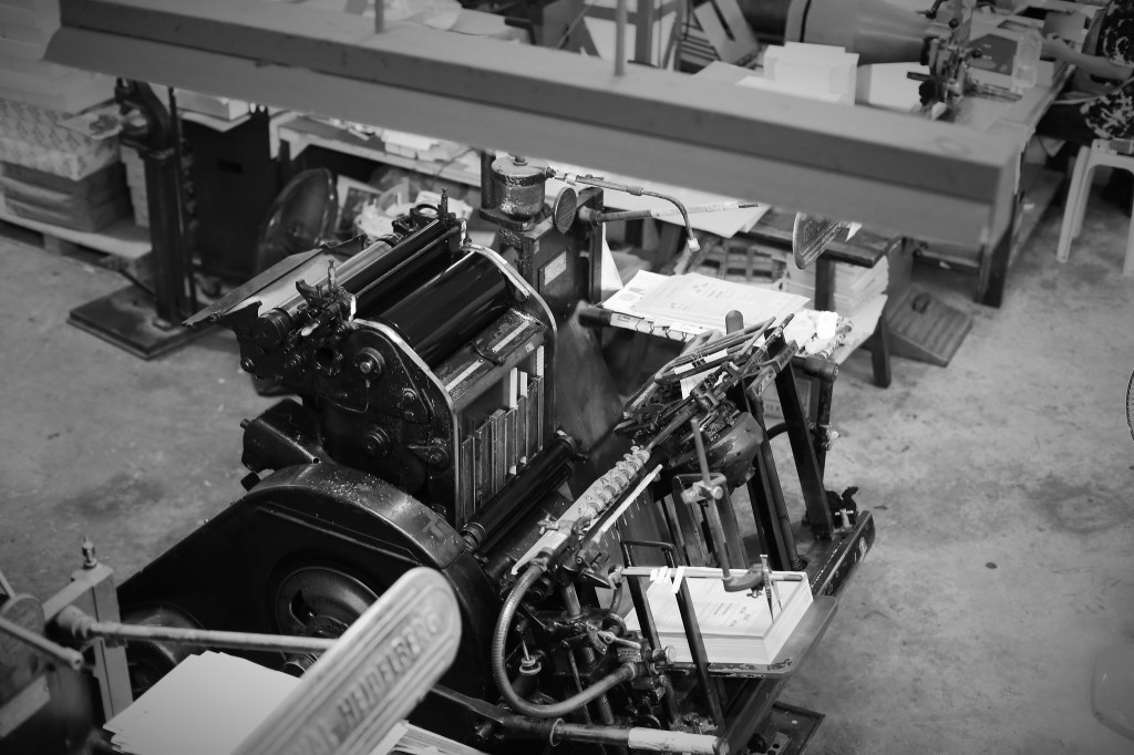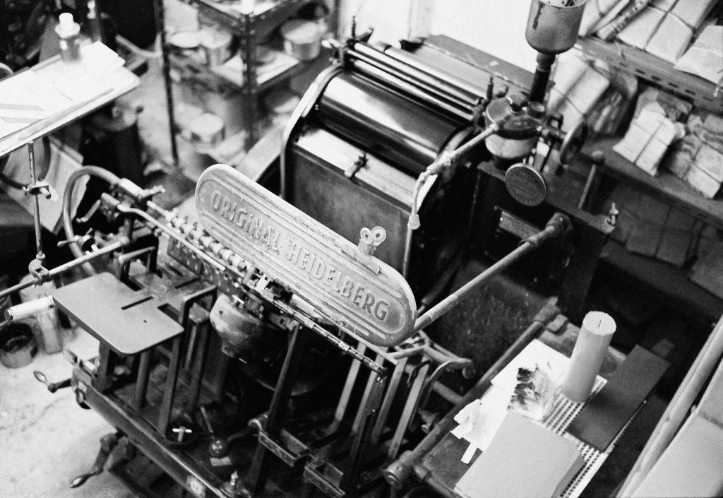 活版印刷をごく簡単に説明すれば、文字がかたどられた金属製の物質をインクにつけて、紙に押し付けて印刷する複製技術とその方法のことである。